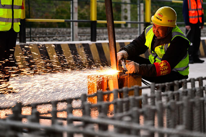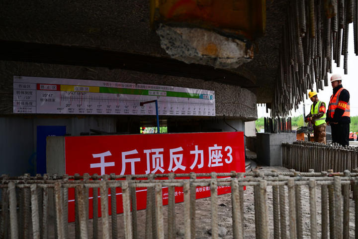 ↑4月21日,中铁十一局工人在合武高铁跨宁西铁路万吨连续梁转体施工现场忙碌。新华社记者 刘军喜 摄