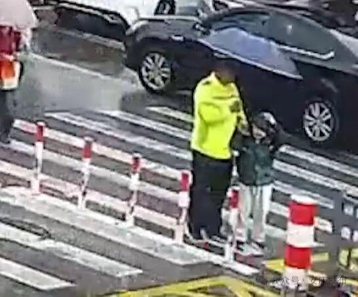 正在校门口执勤的方陈成看到这一幕,立刻快步上前,撑开雨伞护住孩子,紧紧牵着孩子的手,小心翼翼地穿梭在车流中,全程护佑孩子安全抵达校门口。随后,他将手中的雨伞留给孩子,自己转身重回雨中坚守岗位疏导交通。雨水顺着帽檐不断滴落,打湿了警服。