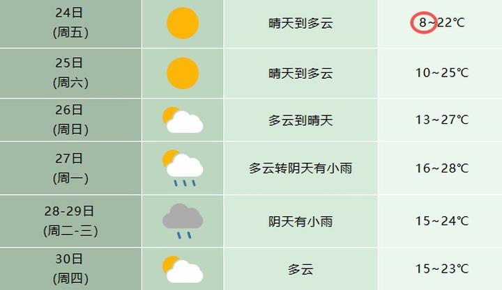 气温:今天沿淮淮河以北气温略有回升,淮河以南最高气温13~16℃。24日后我省最高气温普遍20℃以上,其中26-27日全省最高气温可达26~29℃。