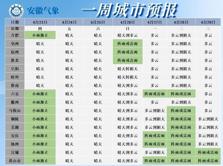 降水:今天我省淮河以南大部分地区小雨渐止。24-26日全省以多云天气为主,仅26日淮河以北部分地区有阵雨或雷雨。27日后我省南部多阵雨或雷雨。