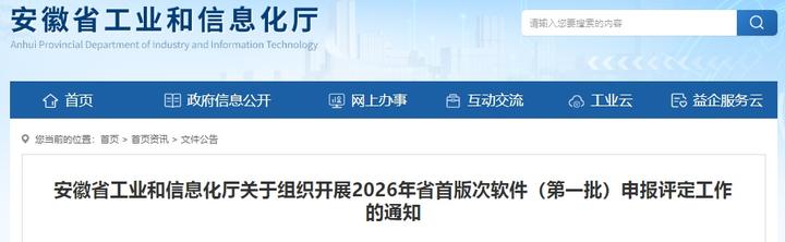 为贯彻落实《支持首台套重大技术装备首批次新材料首版次软件发展若干政策》,根据《安徽省首台套重大技术装备首批次新材料首版次软件评定管理暂行办法》(以下简称《办法》),决定开展2026年省首版次软件(第一批)申报评定工作,现就有关事项通知如下: