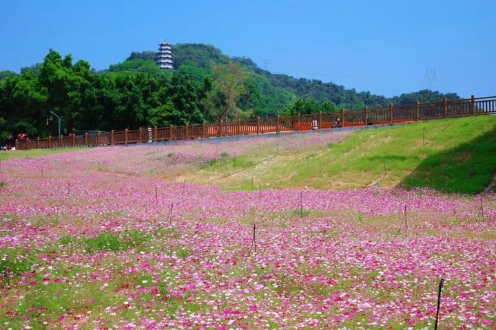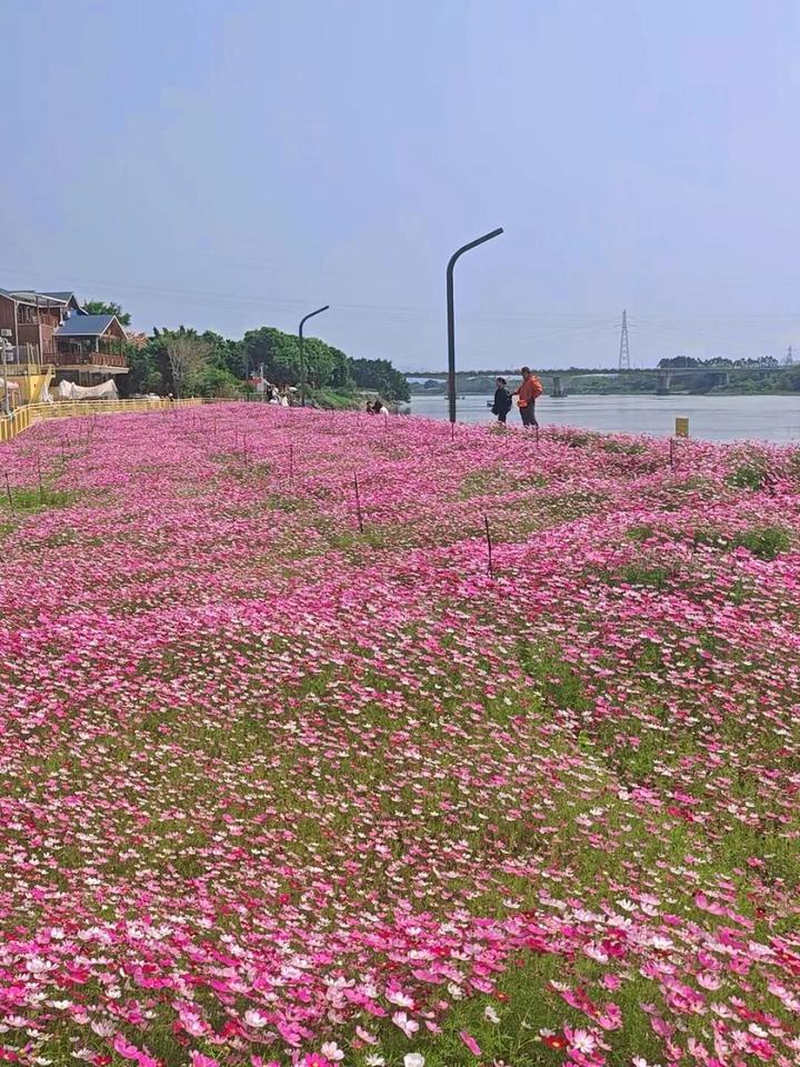 桥闸河畔边,波斯菊铺就春日绮梦