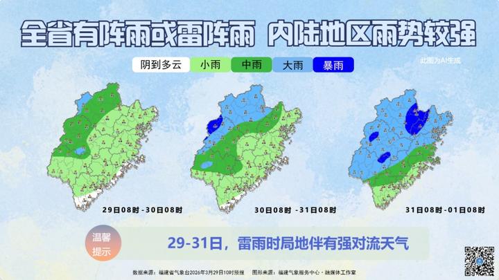 3月30日,全省阴有阵雨或雷阵雨