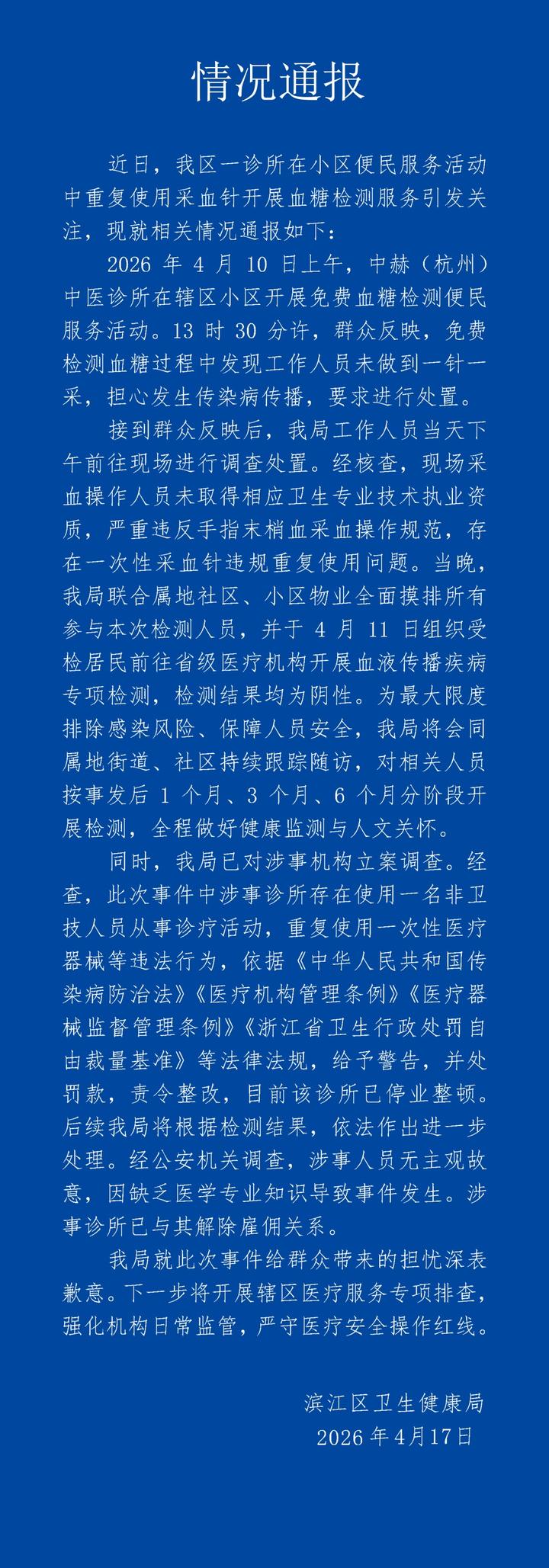 近日,一诊所在小区便民服务活动中,重复使用采血针开展血糖检测服务,引发关注。浙江杭州滨江区卫生健康局4月17日发布情况通报: