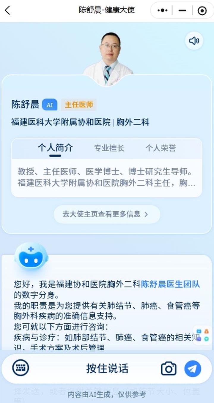 数字分身目前不能替代医生、药师面诊,仅提供健康咨询与科普指导,不做具体诊断、不开具处方、不替代临床决策。