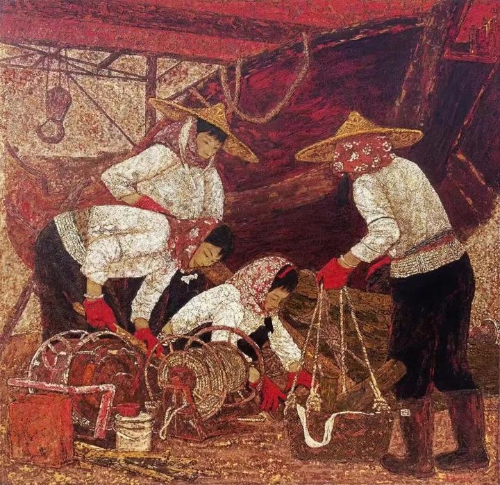 在《渔汛将至》中,她用红色奠定画面基调,以岩彩、银箔营造丰富肌理,用蛋壳镶嵌让人物自然凸显。为表现渔女刚柔并济的特质,她以厚堆积法塑造船体、钢架,用透明漆分染技法刻画人物脸部光影。坚硬的钢管铁架与女性的柔美在画面中相遇,冲突中达成微妙平衡。