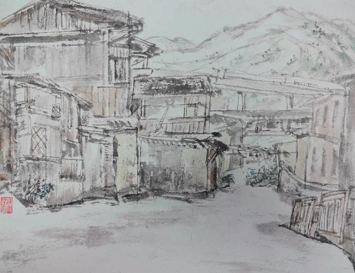 国画写生延平乡村《高铁路过村口》