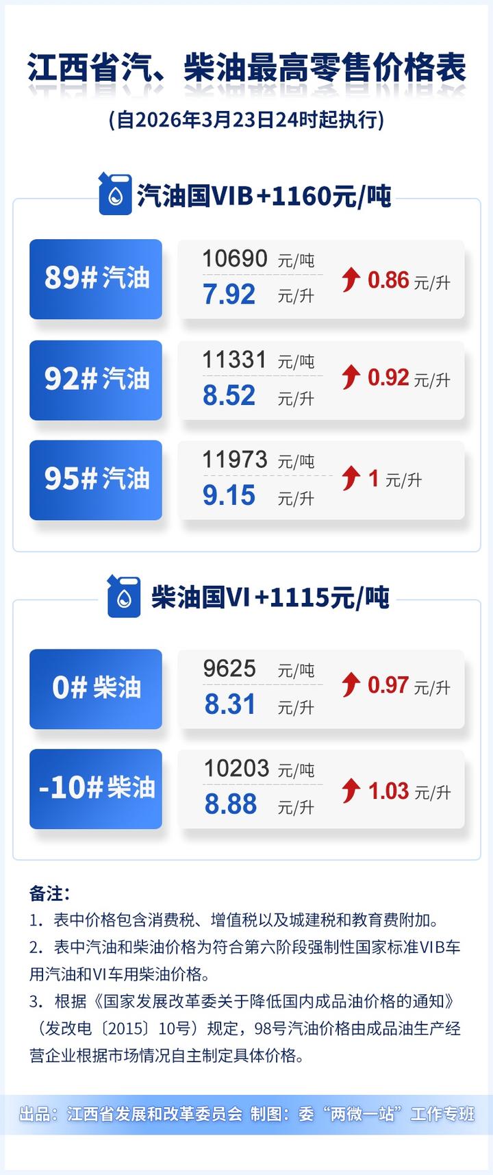 根据江西省发展改革委关于成品油价格调整的通告,我省汽、柴油最高零售价格公布如下。