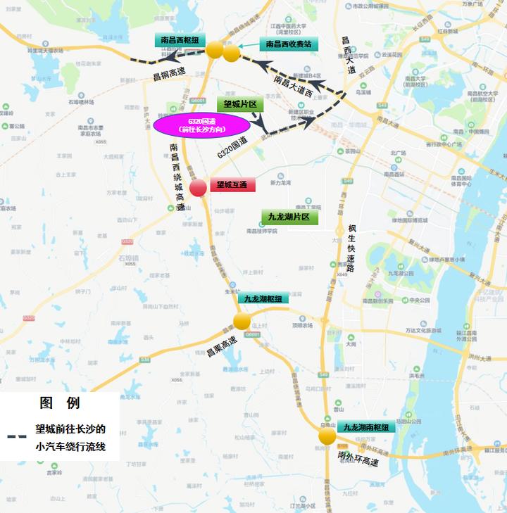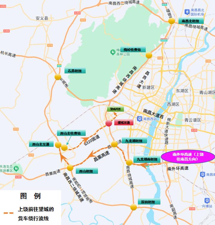 3.上饶往南昌方向:南外环高速→九龙湖南枢纽→九龙湖枢纽→昌栗高速→西山枢纽→西山北互通→西山北收费站→G320国道→望城片区
