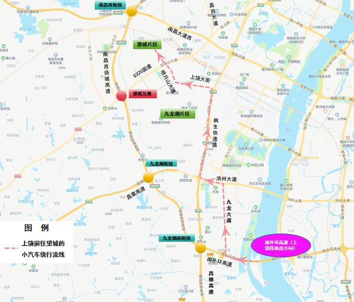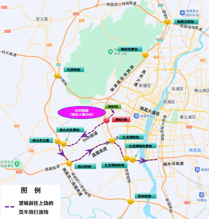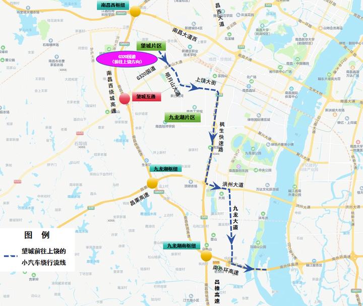 3.南昌往上饶方向:G320国道→西山北收费站→西山北互通→西山枢纽→九龙湖枢纽→九龙湖南枢纽→九龙湖南收费站→南外环高速