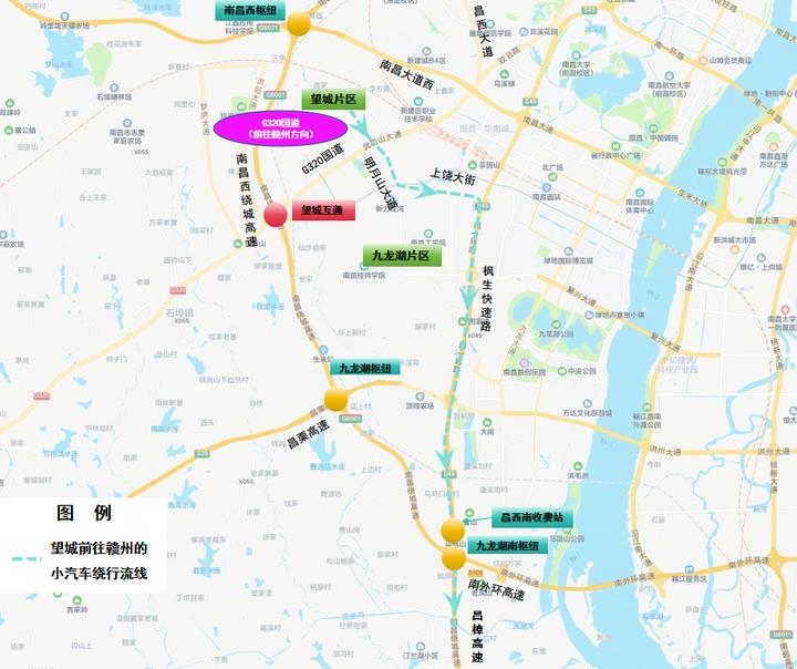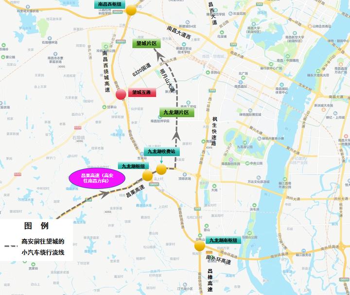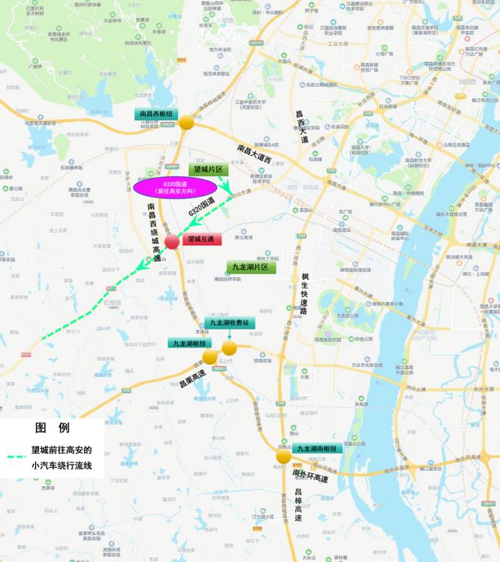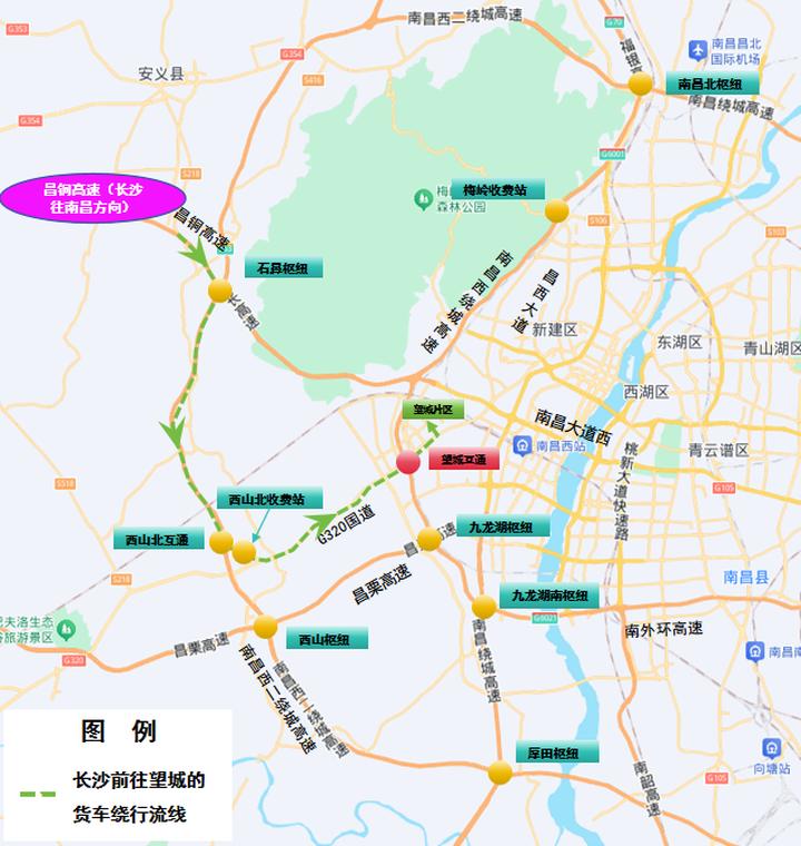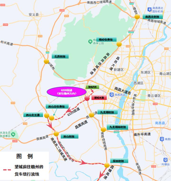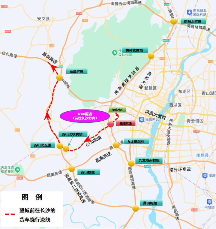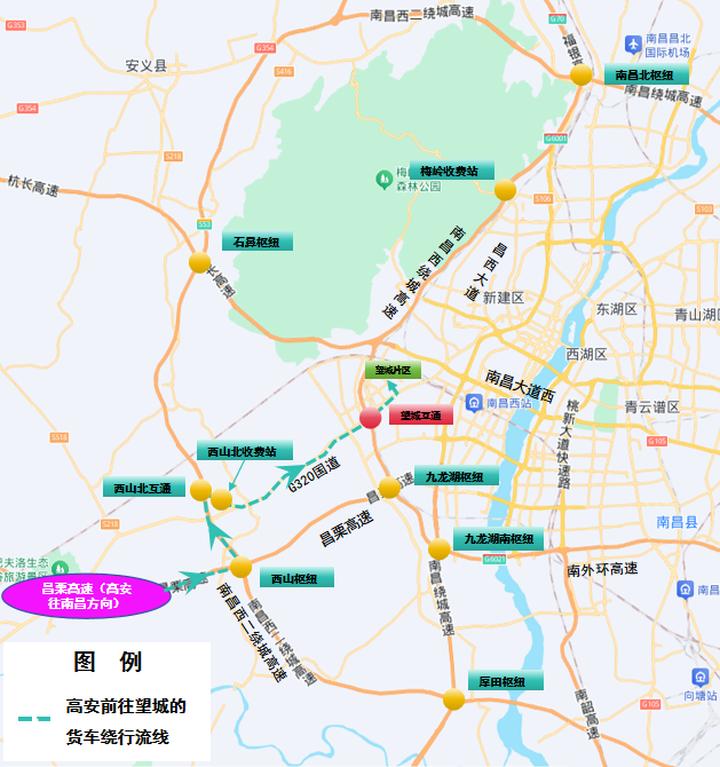 5.高安往南昌方向:昌栗高速→西山枢纽→西山北互通→西山北收费站→G320国道→望城片区