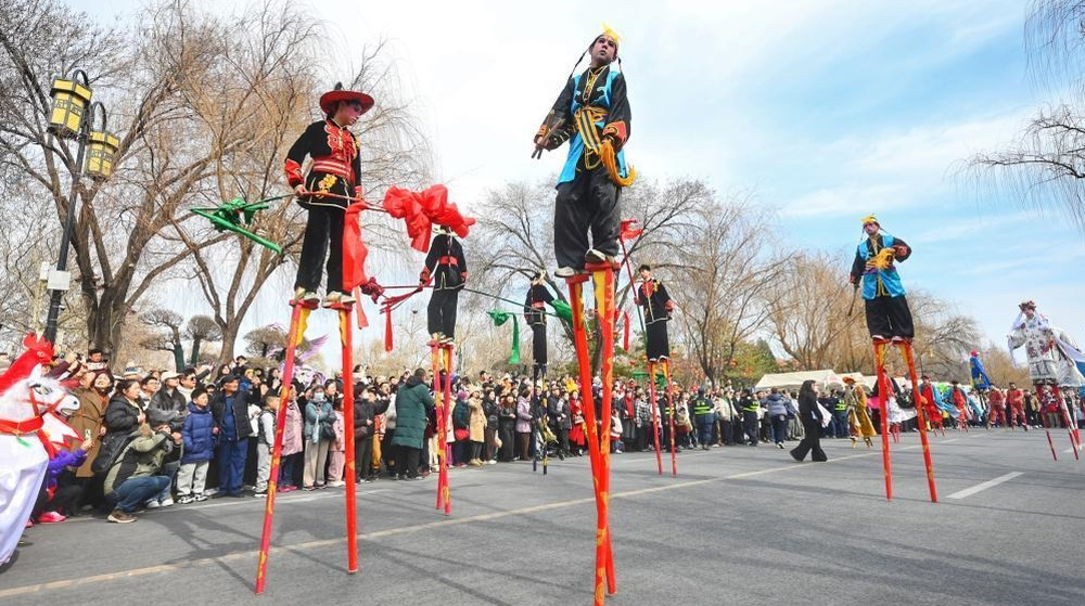 高跷踩街闹新春,济南明湖路上年味浓
