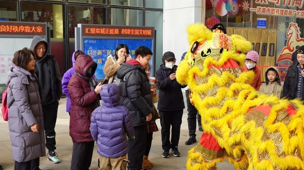 正月初一贺新春 济南文化馆门前传统舞狮来拜年